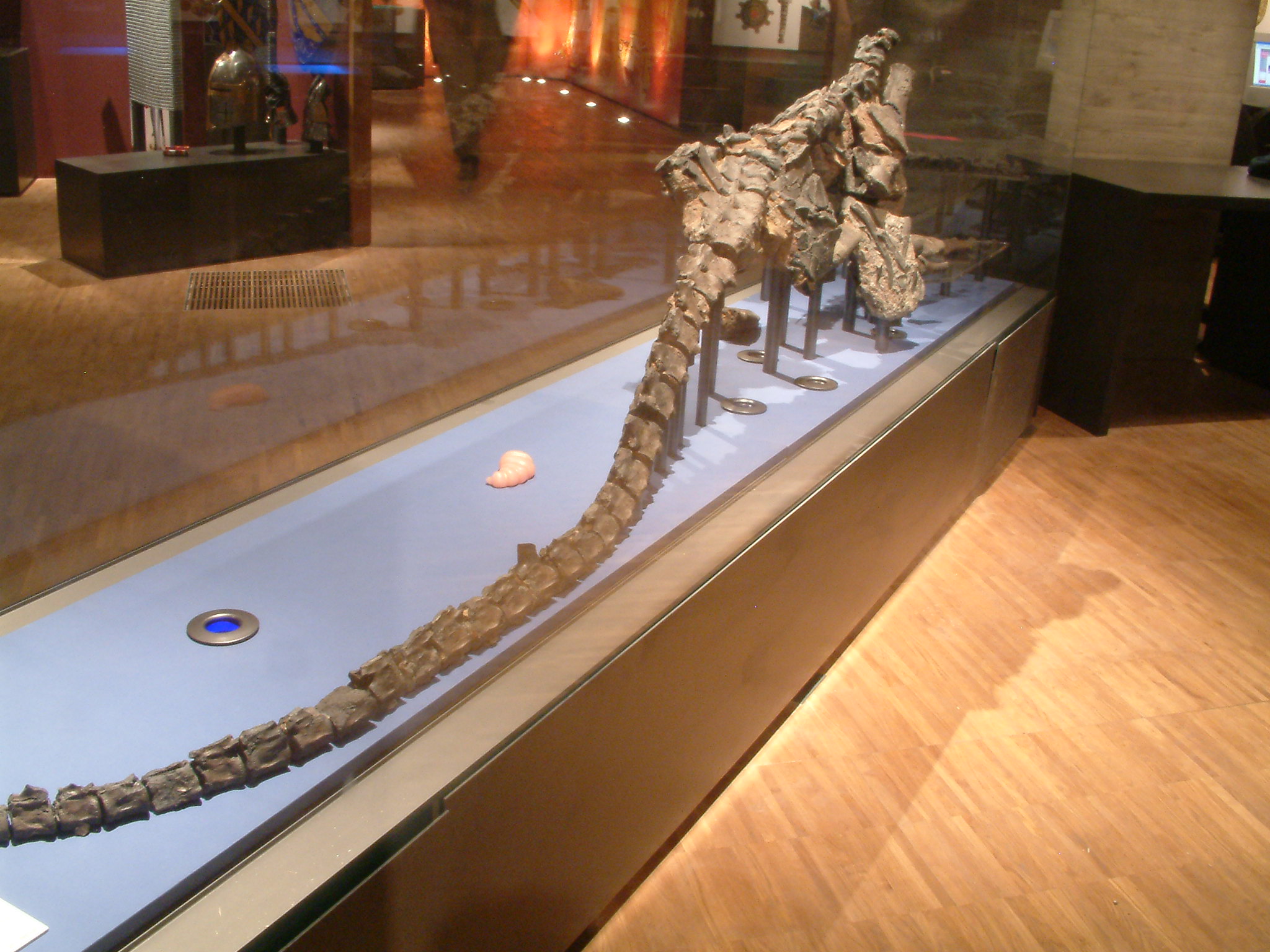 The preservation of the bones is extremely good, and now that they have been cleaned they show detail not recorded in other specimens. The vertebrae of the neck bear light ridges and areas of roughness which give an idea of how the muscles may have been attached and arranged. Shallow channels on the tail vertebrae mark the location of blood vessels, and in one case an area of damaged bone shows where infection occurred around one of these blood vessels.